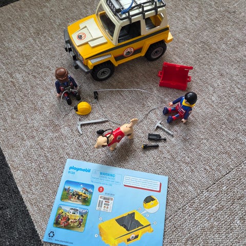 Lekesett med to figurer (mor og barn) og hund. Barnet kan sitte i hunden. Hunden kobles til hundelenken med trekkring via et koblingsstykke og kan trekkes av barn eller av en PLAYMOBIL 1.2.3-figur.