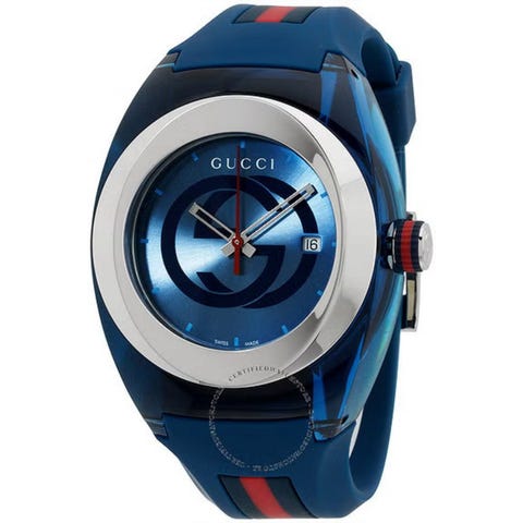 • Stainless steel watch with interlocking double "G" on sunray dial, translucent nylon edging around case, and striped band