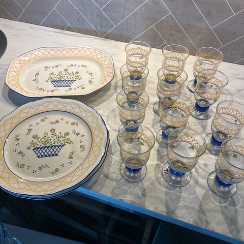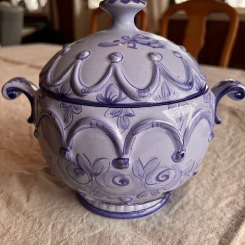 Flott servise fra Amoramica. Passer like godt på hytta som hjemme. Kaffekopper, skåler og asjetter er solgt. Krus med hank solgt. 2 små boller/skåler solgt. 8 vinkurs solgt. Krukker m. lokk solgt.