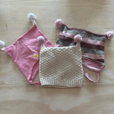 Pent brukte luer, strikkede hals/smekker, strikkesokker og hansker