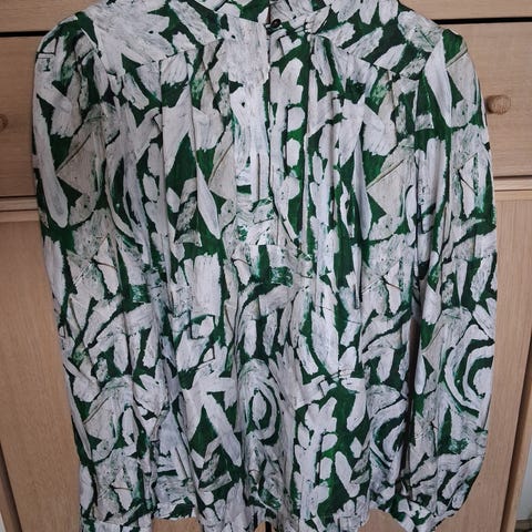 Lekker bluse, står 44, men litt liten i størrelsen, 42 stemmer nok. Blusen er i 100% viskose og foret i blusen er i polyester. Flott mønster.
