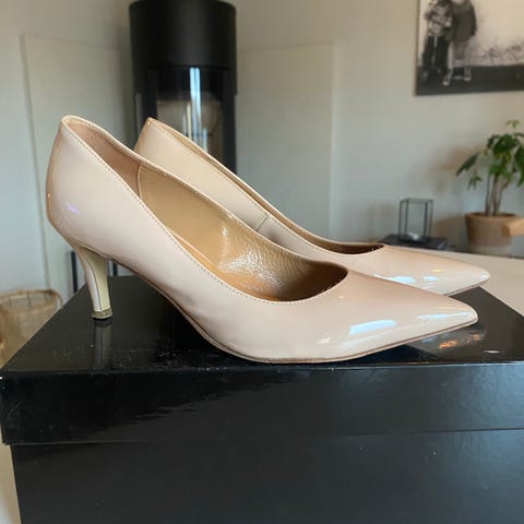 Lekre hæler fra Femme Fatale, made in Italy, vintage. Nude farge med litt «shimmer». Skoene er i skinn. Farge er nude med gyllent skimmer.