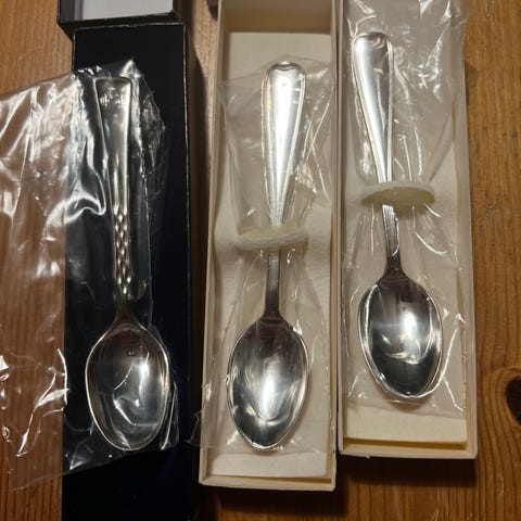 To teskjeer og en dessertskje i nysølv. Se bildet. Og en større serveringsskje, 22 cm. Selges samlet høystbydende over kr 70. Kan eventuelt splittes.