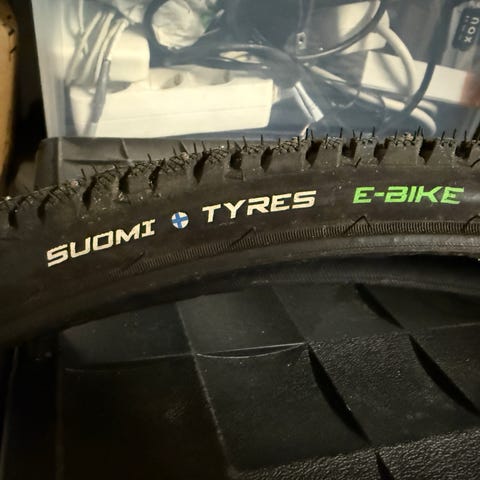 Helt ubrukte piggdekk. Suomi Tyres. Jeg kjøpte de beste piggdekkene på Oslo Sykkelverksted i Sannergata, men ble ingen vintersyklist likevel ... Må hentes sentralt på Grünerløkka.