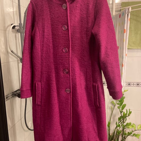 Lite brukt lilla, lang ullkåpe fra Bohéme str. 2 selges. Fremstår som ny, er i en vakker lilla farge, med to lommer og knapper.