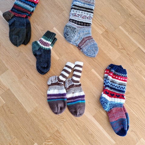 Ukjent merke strikkede sokker i flerfarget garn, unisex. Str 36
