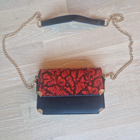 Selger en unik og ubrukt håndveske med sommerfugl på fronten. Str ca. 21cm x 11cm.