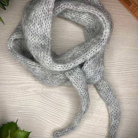 Et stilig og mykt skjerf som gir deilig varme og føles lett mot huden. Perfekt til alle sesonger – både inne og ute. Strikket i Kid Silk med 75 % mohair og 25 % silke.