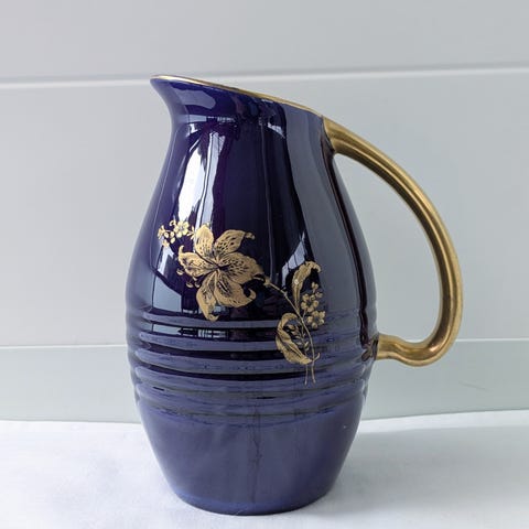 Vakker blå og hvit toddyvann mugge med lokk av bretania-metall eller tinn. Engelsk fra ca 1890-tallet. Meget pen og uten nag eller skader. 19,7 cm høy. Umerket.