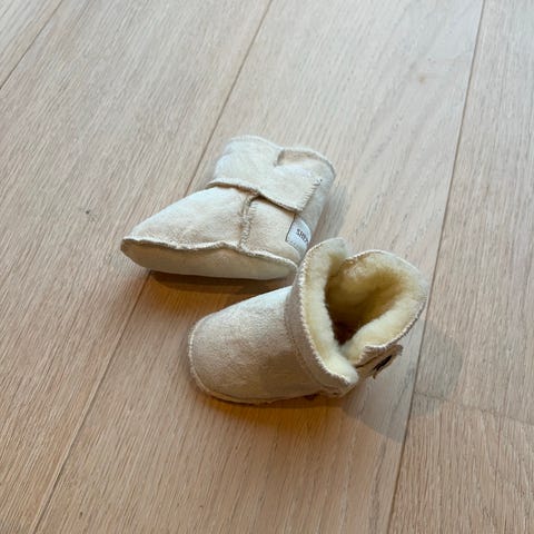 Shepherd saueskinnstøffel, usikker på størrelse men tror vi brukte de ca fra 6 mnd-1 år. Nypris 500. Litt av sømmen foran på den ene bør sys litt.
