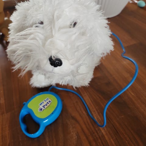 Interaktiv batteri drevet kosedyr, kosebamse i form av hund som bjeffer, går og logrer med halen. Stort sett oppholdt seg i en kasse dessverre og trenger ett nytt hjem og noen som behøver ett kosedyr å være glad i.