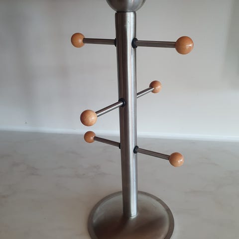 Dekorativt krusstativ for 6 kopper. Sort metall og tre.