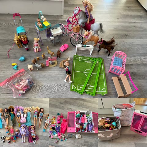 Hest/ponny fra Baby Born, dukke i badekar, et stellebord, "sminkedukke", sminkespeil med litt yilbehør, ponnier som ligner på My Little Pony, Disney Princess-veske, bamser fra TY og diverse andre.