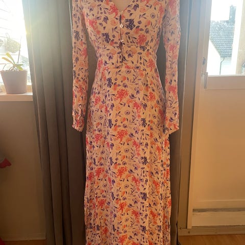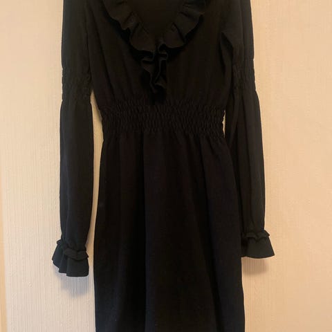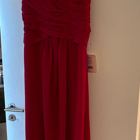 Selskapskjole selges, nydelig kjole med skrå kjørt. Åpnes med glidelås fra siden. Den er sydd på mål men tilsvarer en xs/s. aldri brukt. er renset