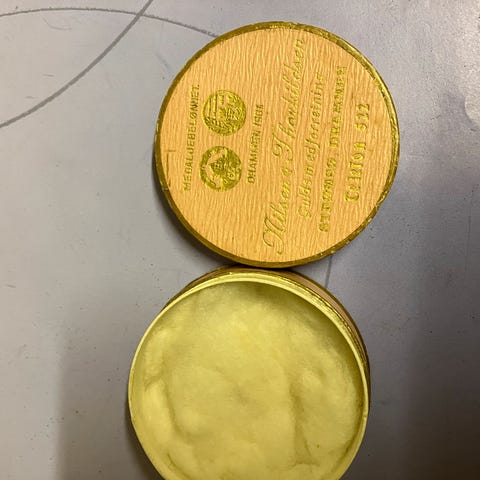 liten smykkeboks i papp ca5x5cm og 1,5 cm tykk