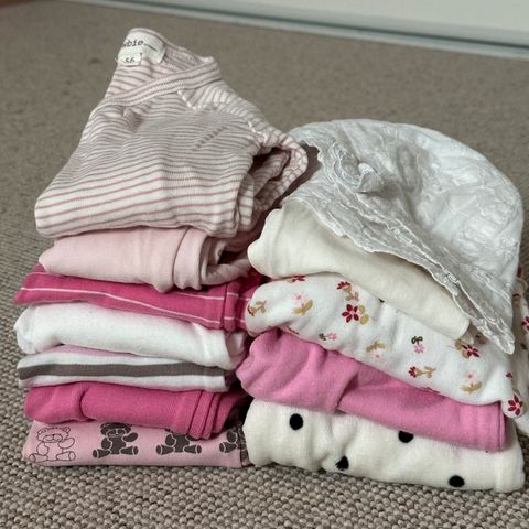 6 bodyer, 2 tynne luer, 5 pysjer (2med glidelås og 3 med knapper), 4 bukser og en cardigan.