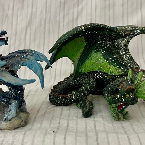 Glitrende blå drage. Figuren er ca 23cm høy. Den har isopor form for transport, men ikke direkte eske. Stått til pynt, ingen kjent skade, men maling er aldri perfekt på disse.