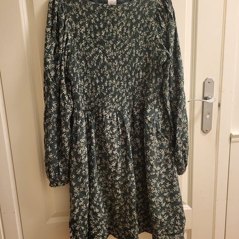 Kjole fra NORR i blomstermønster i fargene sort, hvitt, blå og grønn. Str 40. Glidelås bak. Vaffelsøm rundt livet bak. Mini-skulderputer. Fine detaljer. En veldig fin kjole! Ingen skader, flekker eller hull.