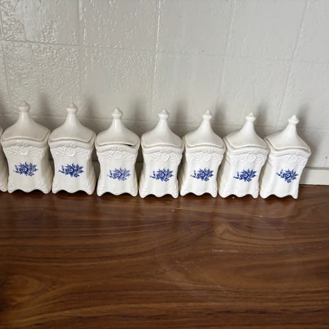Nydelige Pent brukte krydderkrukker fra Striegau Lilo. De har blått mønster og gullkant. Tror de er fra Tyskland 1920-tallet.