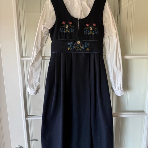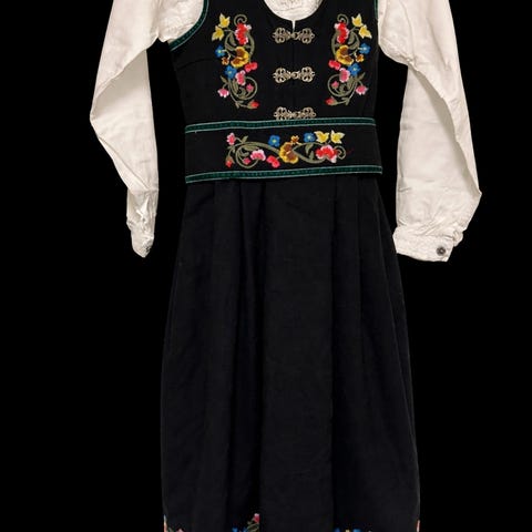 Nydelig festdrakt til jente i meget god kvalitet. Bomullsskjorte med blondebroderi og sølvfarget knapper. Bærestykke med sølvfarget hempelukning, broderi og fløyelskanting. Stakk i ullkvalitet med broderi i nederkant, samt belte med fløyelskanting og broderi