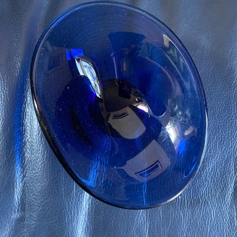 Pen blå skål munnblåst glass «Blåst». Ingen skader bortsett fra et lite nag( se bilde). H: 9cm, dia:15 cm.