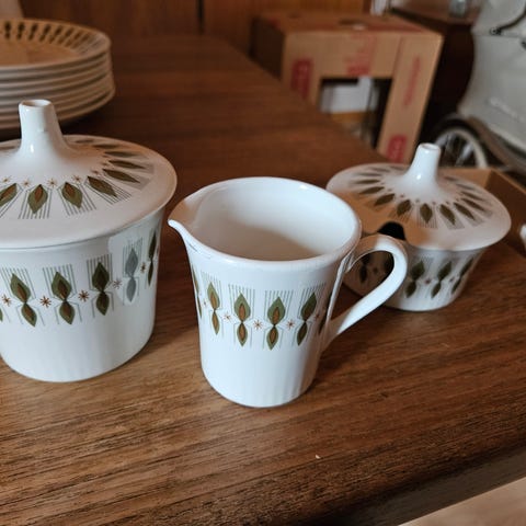 Sukkerskål og liten skål til salgs. De er jo gamle, men ser omtrent nye ut. Kan hentes i Stavanger eller sendes med "helt hjem".