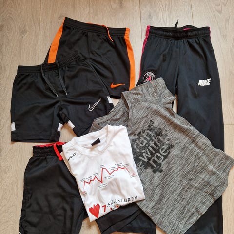 Treningstøy til 9-10 åring. 3 trøyer, 1 shorts, 1 jakke/genser og 1 tights. Hentes på Kjelsås.