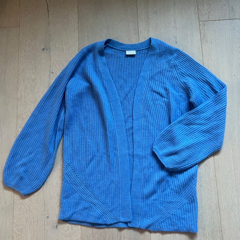 Pent brukt lang cardigan med lommer, 50% ull.