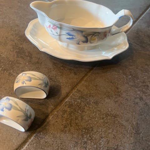 En enslig asjett og en enslig skål selges, i serviset Vieux Luxembourg fra Villeroy & Boch.