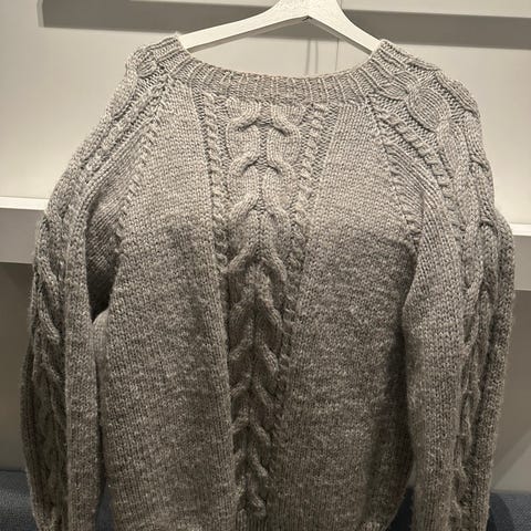 Det står størrelse L på den, men den har tovet seg litt i vask, så den tilsvarer nå størrelse M til dame eller S til mann, vil jeg si.