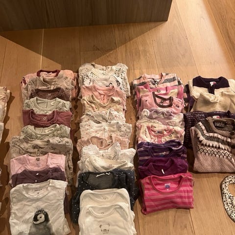 Selger klær til baby str 50 til 86. Ca 74 plagg (følger også med joggesko str 21 og 3 tynne luer, og en strikket lue for eldre barn.
