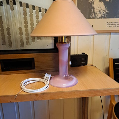Selger 90 mm patron lampe. Har pusset messingen og lakkert den med klarlakk. Har også brukt smeltet «dykkerbly» i bunn av patronen, for å gjøre den mere stabil. Patron høyde 60 cm, 73 cm med skjerm. Skjerm 45 cm i diameter