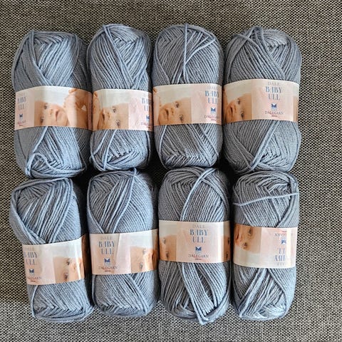 Dale baby ull. 1. Lyse gul F. 2203 P. 5582. 1. Lyse blå F. 5931 P. 7437.