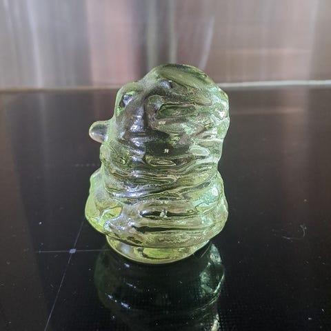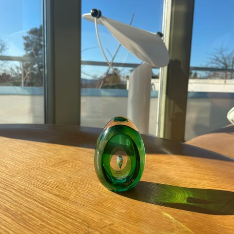 En høy og flott vase med grønn glasspynt og lysestake i krystall med fargeskulptur på innsiden. Begge er i god stand.