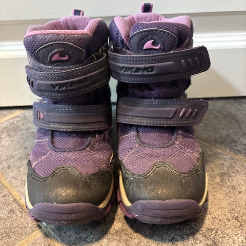 Grå sko med lilla detaljer. De beste vinterskoene fra Viking. Varme og gode og svært holdbare. Disse er lite brukt da frøkna vokste raskt ut av de. Se bilder for bruksmerker.