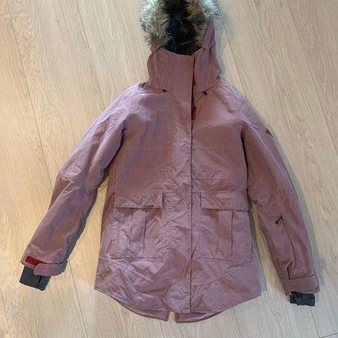 Str XS. God jakke til sen høst, vinter og tidlig vår. Avtagbar hette som også kan justeres. Lukking med glidelås og borrelås. Snølås og mulighet til å justere stramming nederst. Glidelås for lufting under armer. Borrelås har noe ull etc som er festet fast fra klær som er brukt sammen med jakka. Noe smuss, særlig på det hvite stoffet som er noe synlig. Se bilde og zoom inn for å se nærmere. Hempe inni jakka til å henge den opp har løsnet og må evt festes. Ellers er jakka i god stand.