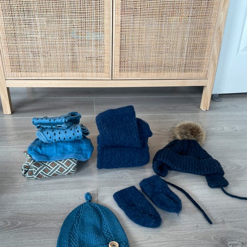 Ubrukt lue, sko/sokker/tøfler og pannebånd str 1-2 år