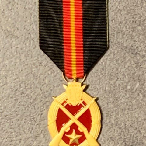 Jeg selger miniatyrversjonen til Verneidrettsmedaljen i sølv. Den ble innstiftet i 1947 og tildeles av Norges Forsvarsforening og brukes typisk som "bestemannspremie" i større skytter- og militære idrettskonkurranser. Sølvstempler på reversen, 925S.
