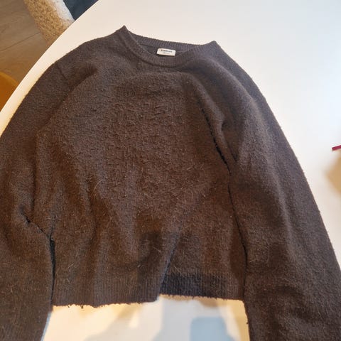 Klassisk blå genser med «glidelås-detaljer» i sidene.