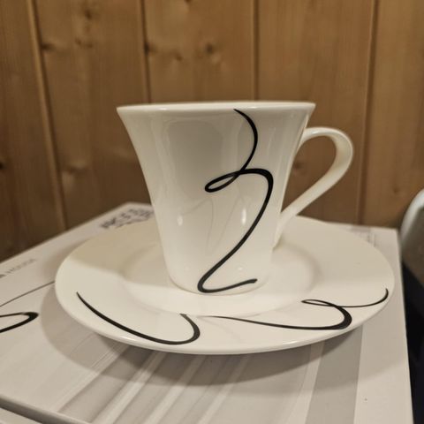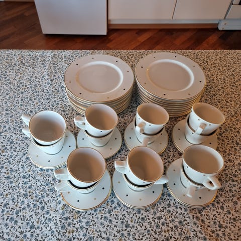 4 stk. kaffekopper, m/underfat og asjetter (19 cm). Det ene underfatet har en svak sprekk.