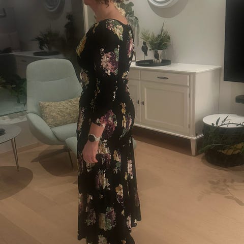 Ubrukt og vakker kjole fra ByTiMo i str. XS, blå dekorert med blomster. Midjemål er ca. 30 cm målt rett over i front.