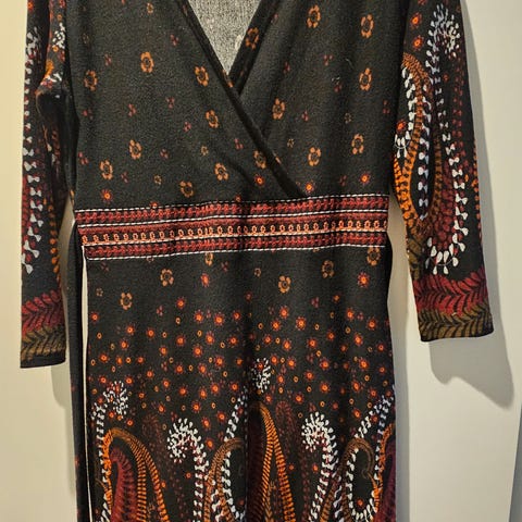 Ny kjole , aldri vært brukt men lappen tatt av! - merke «Anna Field» størrelse 40 kvalitet Jersey , overdelen tettere til kroppen enn underdelen .- underdelen har vidde i skjørtet med fine legg. - en fin kjole til en som kan passe den, i nydelige farger . ( se bilder) kan sende med posten Bring , kjøper bet porto