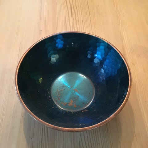 Fin gammelt skål eller fat med høy kant. Med tungekant. Kan henges på veggen når det ikke er i bruk.