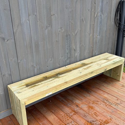 Hagebenk i imp furu 36 mm trevirke. Lengde 1800 mm. Høyde 850 mm. Dybde 600 mm.