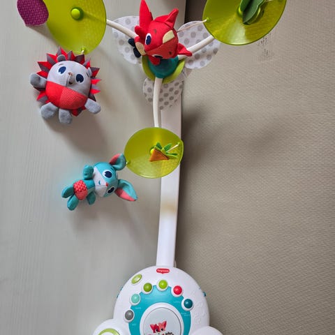 Alle lekene er håndtovet, karusellen har 35 søte melodier og kan henges til alle typer baby senger. Stand- som NY.