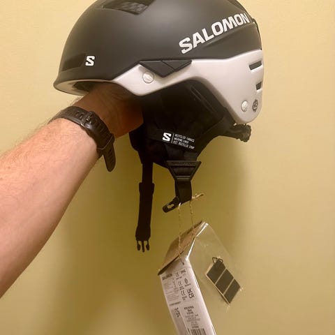 Salamon mtn lab størrelse medium, den er brukt bare noen få ganger og bare noen små riper på toppen av hjelmen men er nesten ikke synlig, fungerer som den skal og er også justerbar, ny pris 2300kr på fjellsport.no😊 bare send melding om interesse eller spørsmål