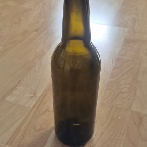 Brun glassflaske med skrukork. Flasken er laget av brunt glass og har en svart skrukork for sikker lukking. Egnet for oppbevaring av væsker eller andre substans. Praktisk for hjemmelaboratorier eller kjøkkenbruk.