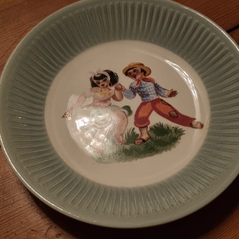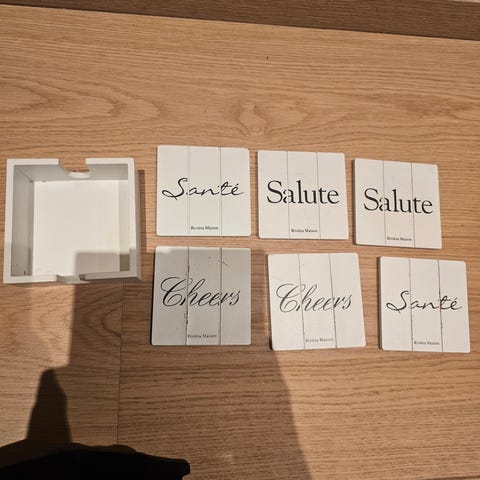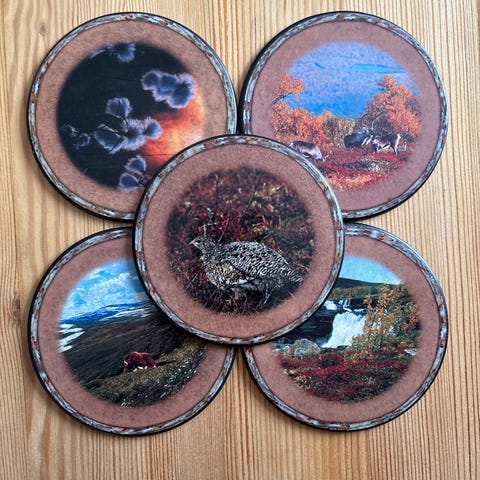 Drikkebrikker i holder, Ø 9 cm. Settet, fra 80-tallet, inneholder seks brikker med bilder av kjente steder på Lanzarote, inkludert vulkaner og strender. Passer godt som dekorativt element eller praktisk underlag for glass og kopper.