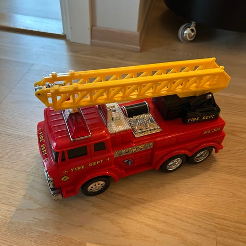 Morsom brannbil, pent brukt. Vanntank og slange til å slukke brann med. Høyde med kran ute, 43 cm og lengde er 36 cm.