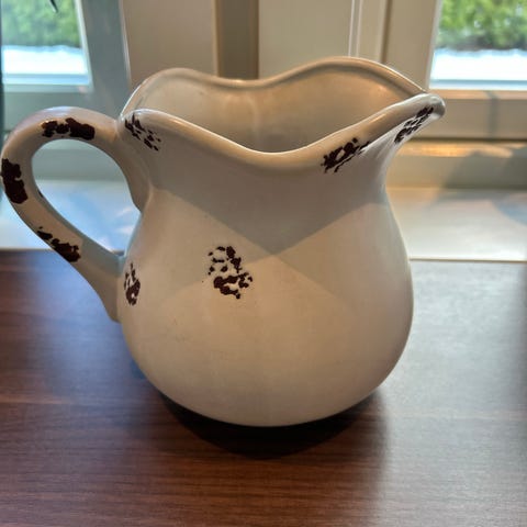 Svensk keramikk-mugge fra Paradisverkstaden Öland. Blått blomstermønster, glasert.